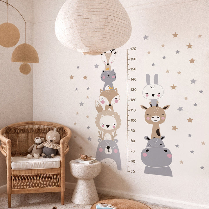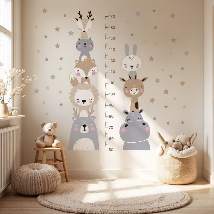 Urocza naklejka na ścianę – miarka wzrostu ze zwierzątkami i gwiazdkami to szybki sposób na udekorowanie pokoju dziecka. Ekologiczna, bezpieczna i łatwa w aplikacji. Drukowana w Polsce, pozwala śledzić wzrost malucha i jednocześnie ozdabia wnętrze.