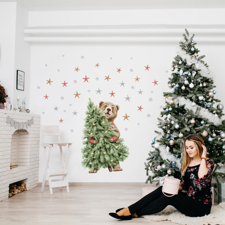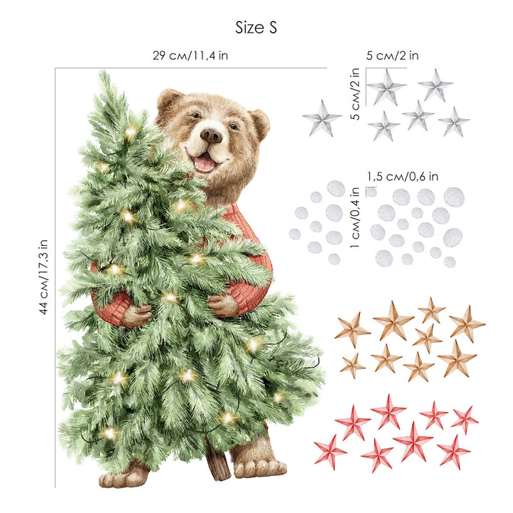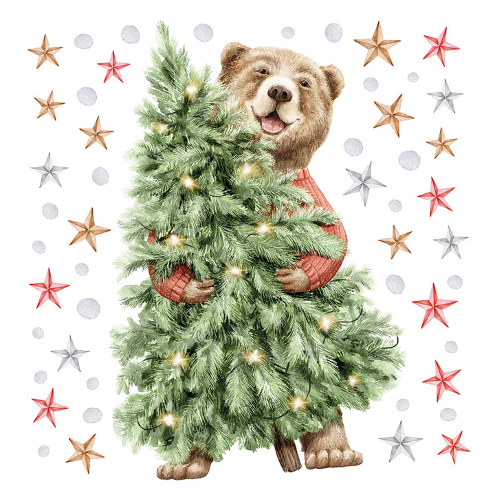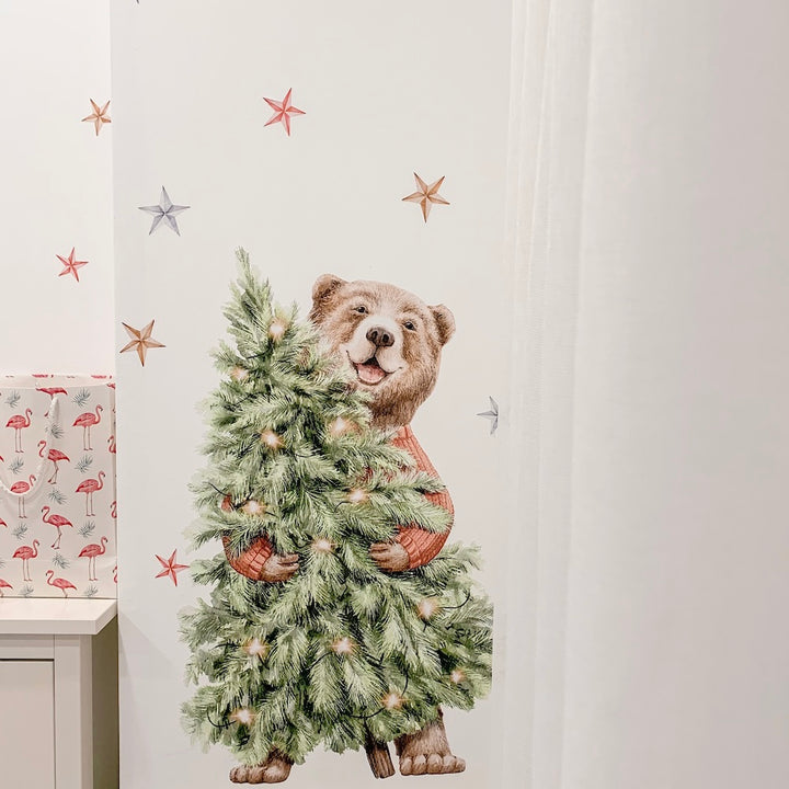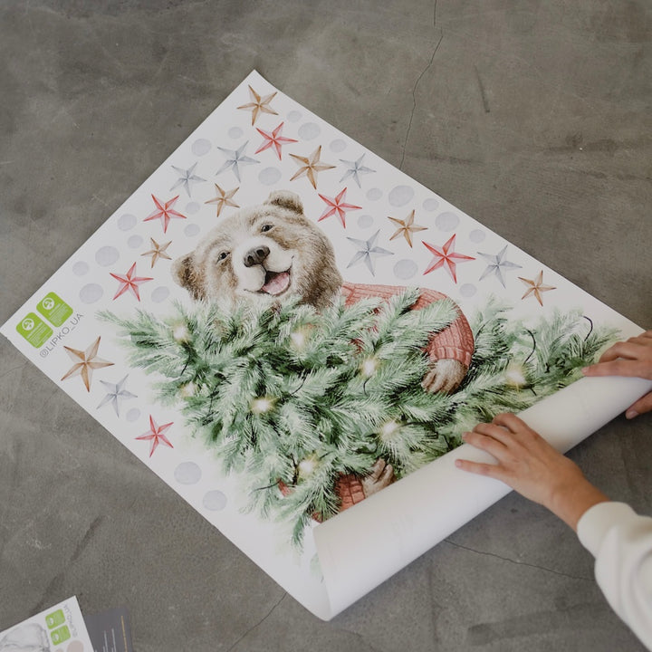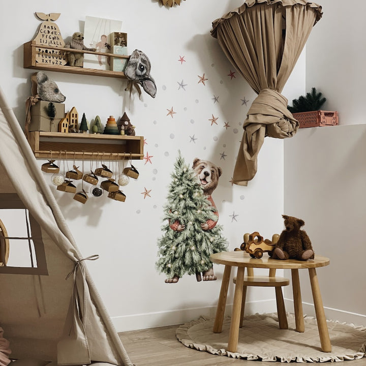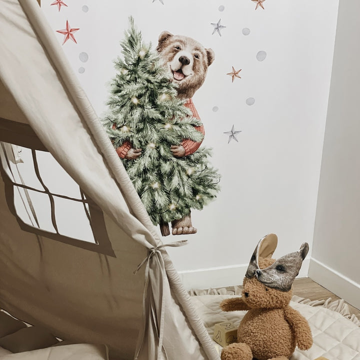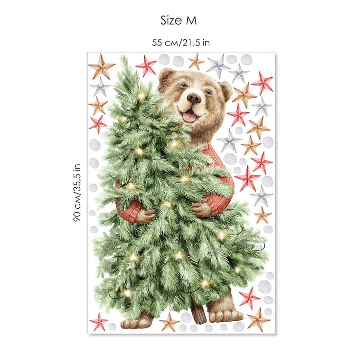 Dodaj magii świętom dzięki naklejkom na ścianę z uroczym misiem przytulającym choinkę. Ekologiczne, łatwe w aplikacji, idealne do pokoju dziecka, salonu czy na okna. Dostępne w rozmiarach S, M, L – tworzą ciepły i bajkowy klimat świąteczny. Drukowane w Polsce.