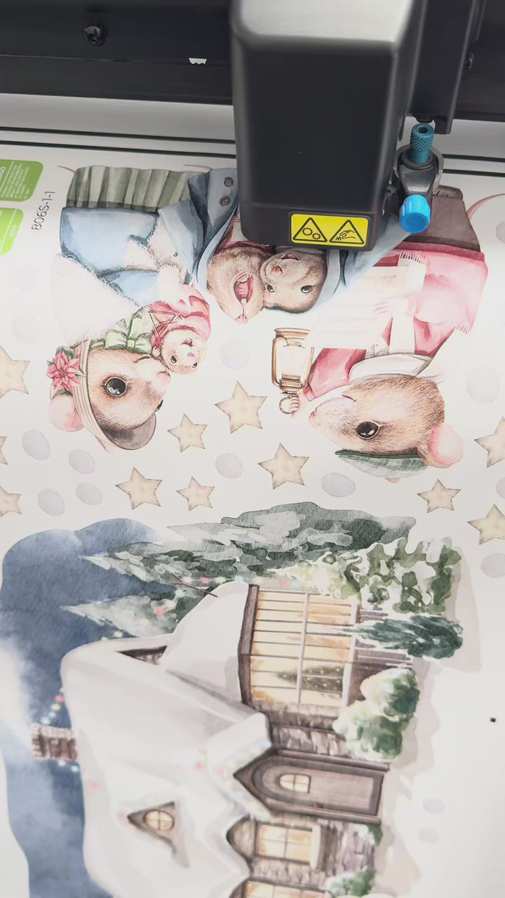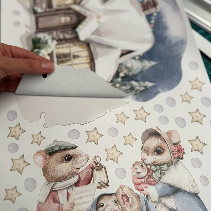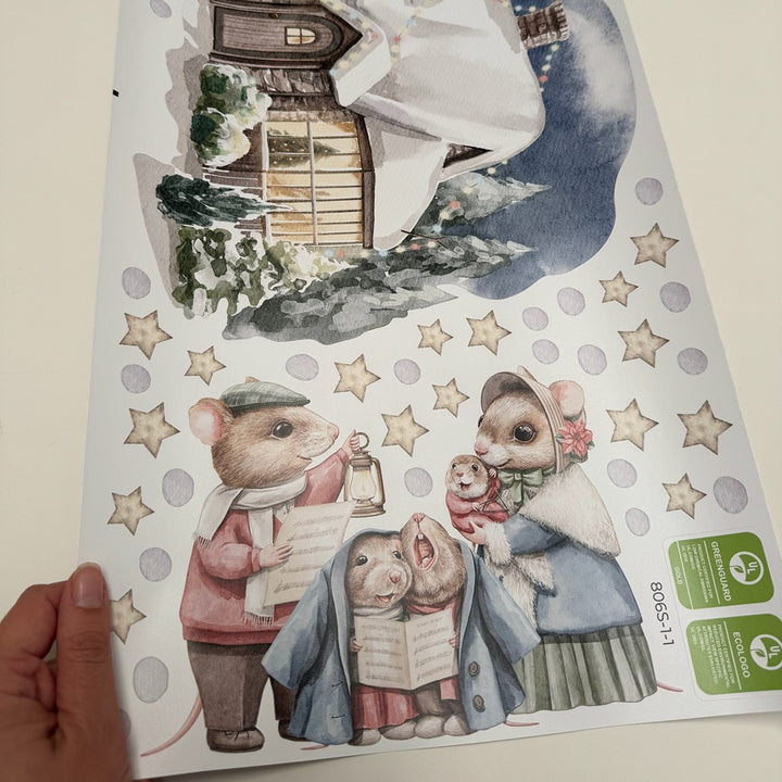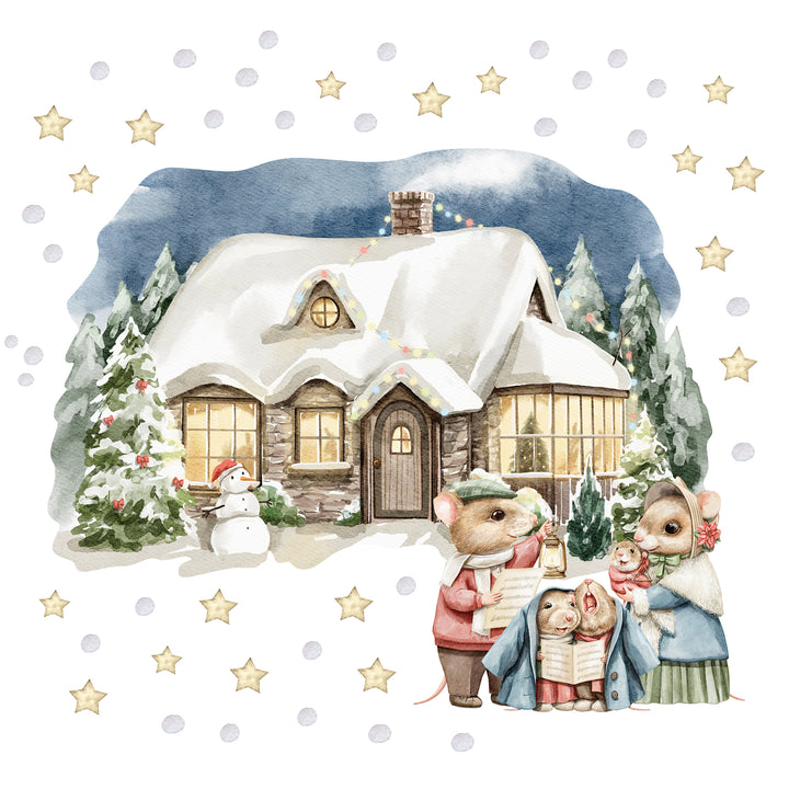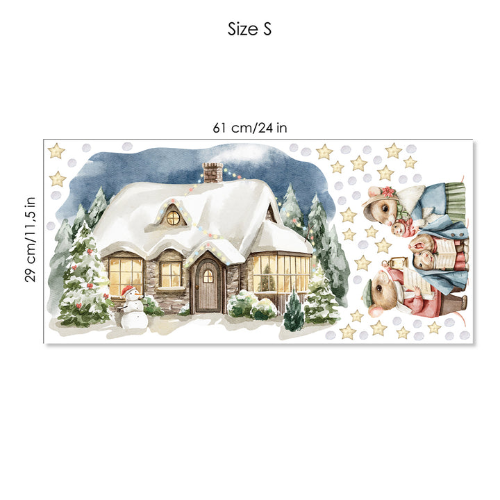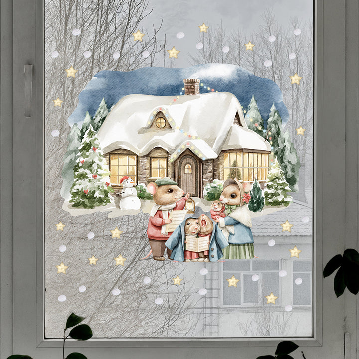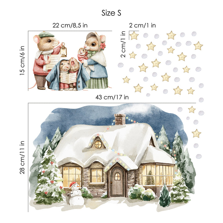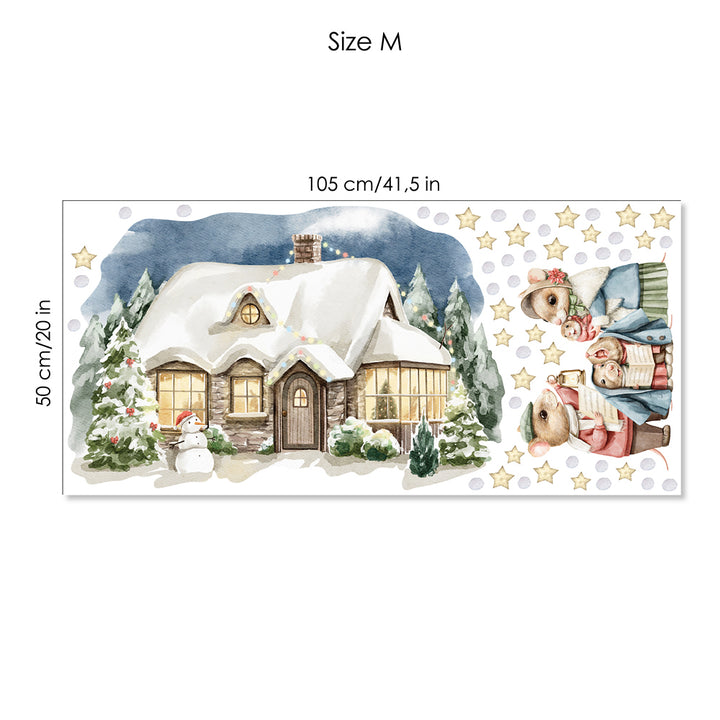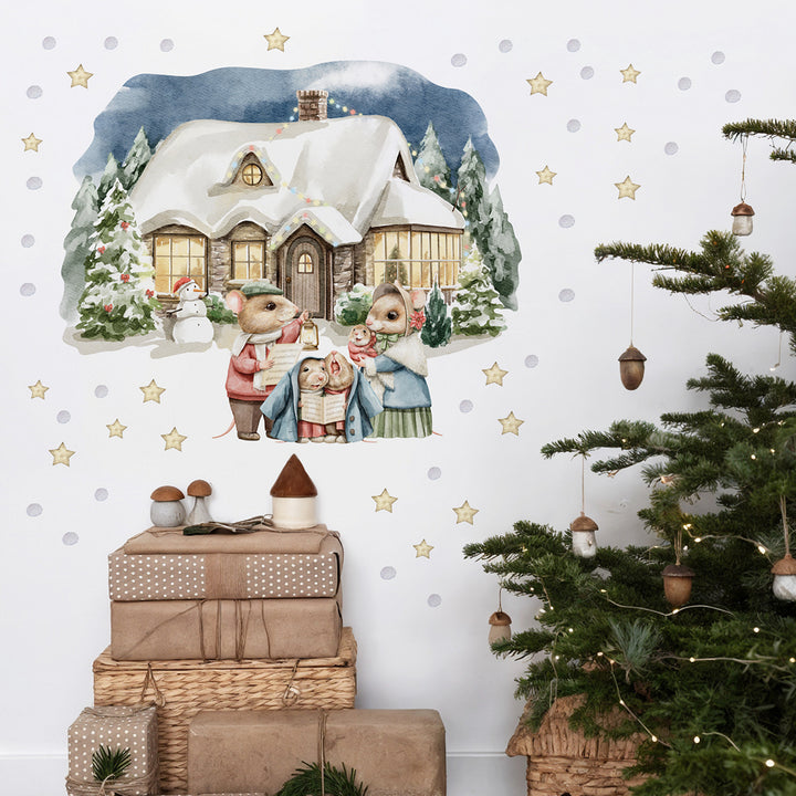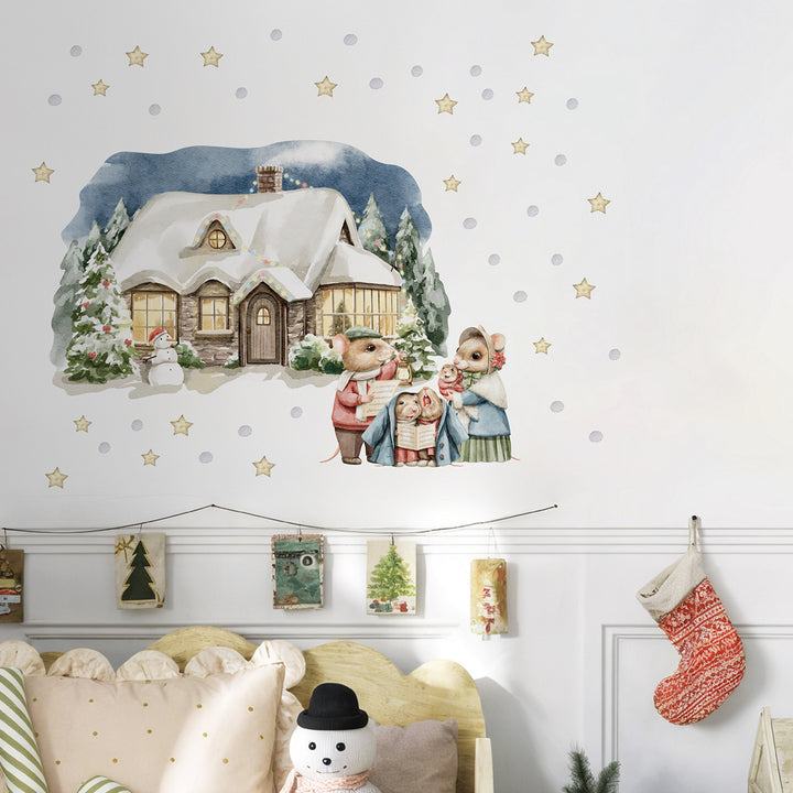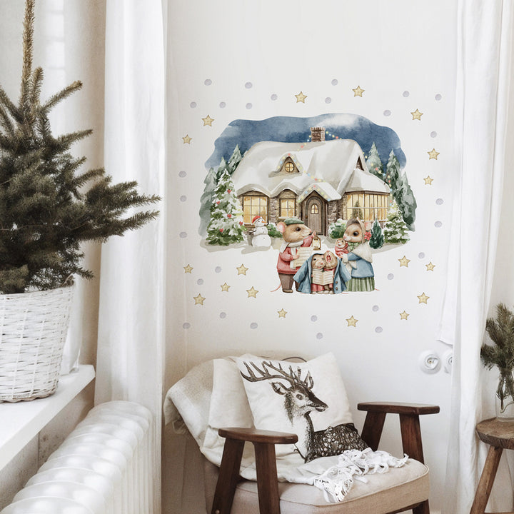 Naklejki na ścianę Świąteczny Domek | Myszki Kolędnicy i Bałwanek