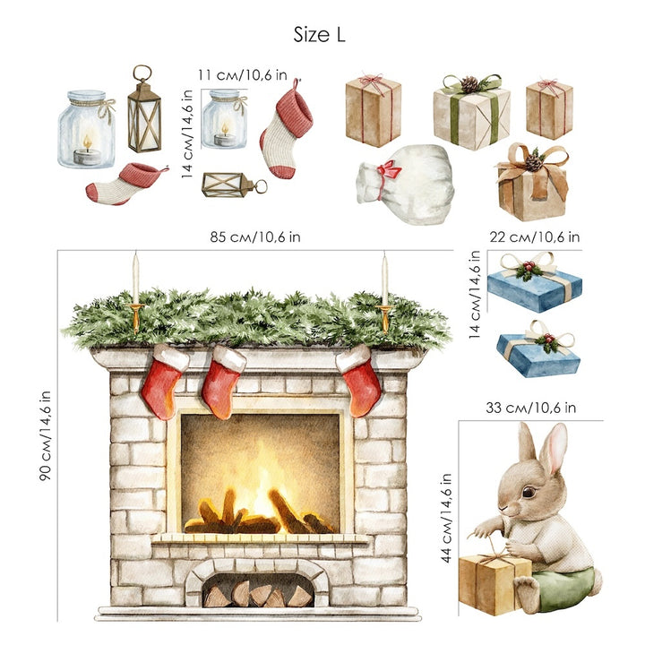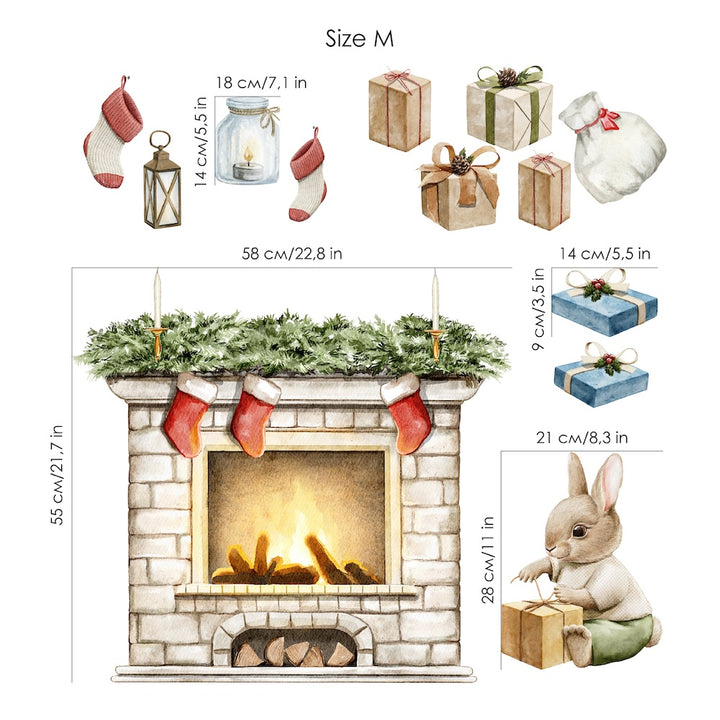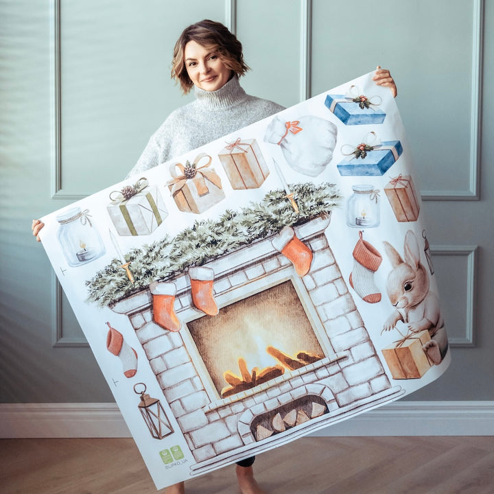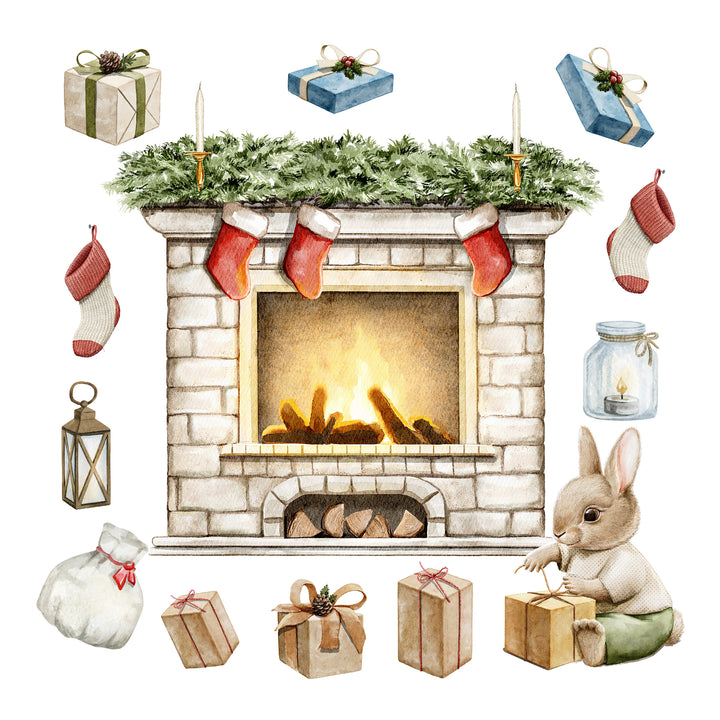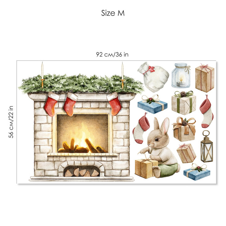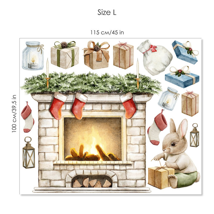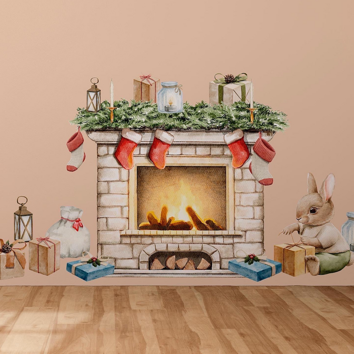 Stwórz przytulny klimat świąt dzięki naklejkom na ścianę z kominkiem, skarpetkami, prezentami, latarenkami i uroczym króliczkiem. Ekologiczne, łatwe w aplikacji i bezpieczne. Idealne do pokoju dziecka, salonu czy dekoracji sezonowej. Dostępne w rozmiarach M i L.