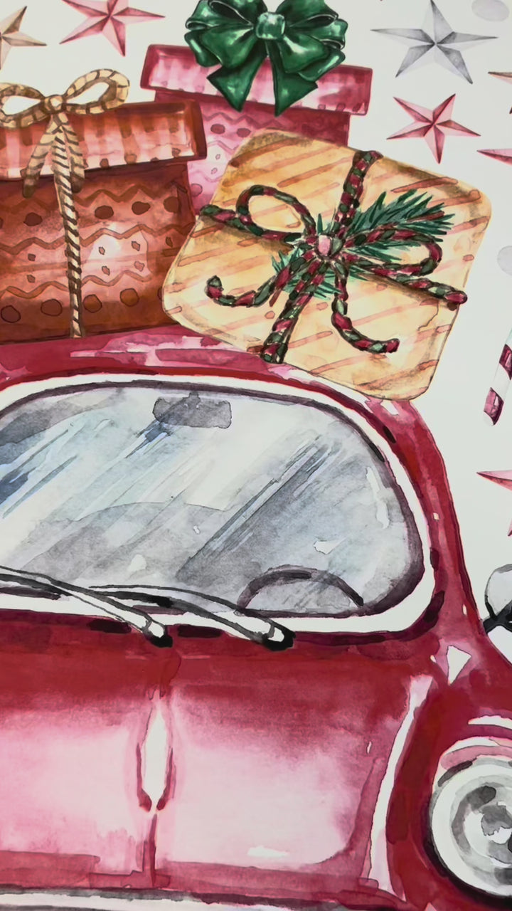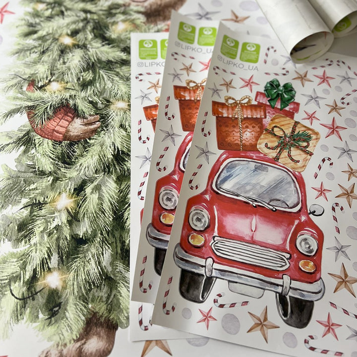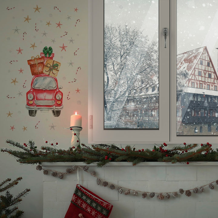 Świąteczne naklejki z czerwonym samochodem, prezentami i laskami cukrowymi dodadzą magii każdemu wnętrzu. Ekologiczne, łatwe w aplikacji – idealne do pokoju dziecka, przedszkola lub salonu. Doskonały pomysł na świąteczny prezent i dekorację zimową. Drukowane w Polsce.