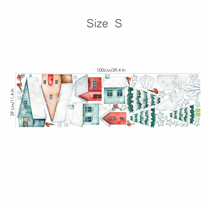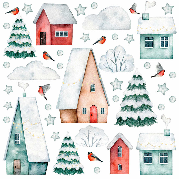 Naklejki na okno Świąteczne Domki i Choinki | Gwiazdki, Śnieg i Ptaki