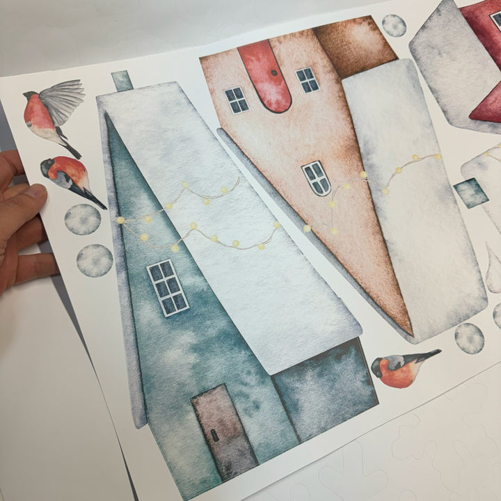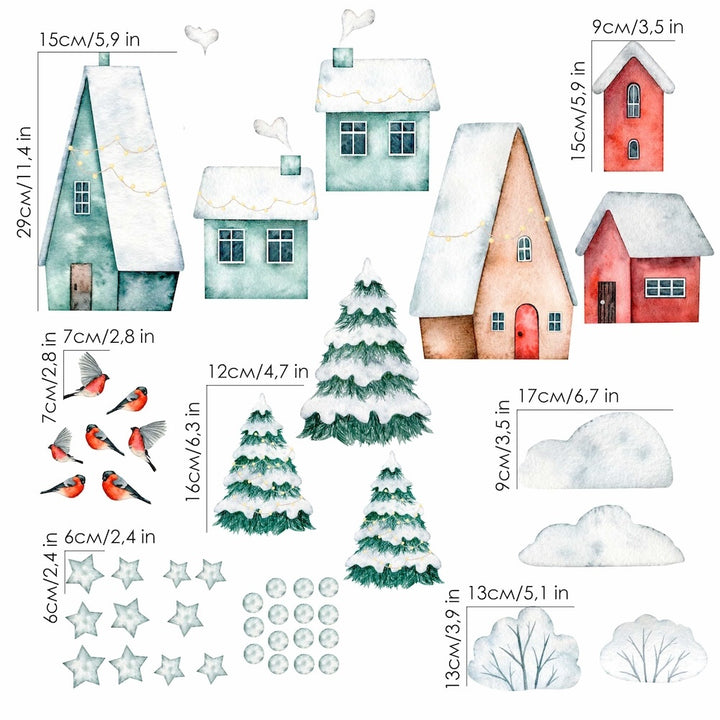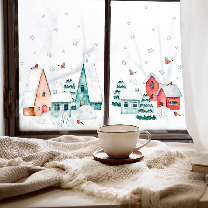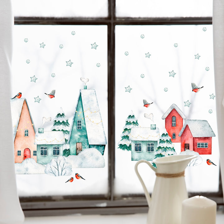 Stwórz zimową wioskę na swoim oknie dzięki świątecznym naklejkom z domkami, choinkami, gwiazdkami, śnieżkami i ptakami gilami. Idealne do pokoju dziecka, salonu lub dekoracji sezonowej. Ekologiczne, łatwe w aplikacji, jednostronne i nieprzezroczyste.