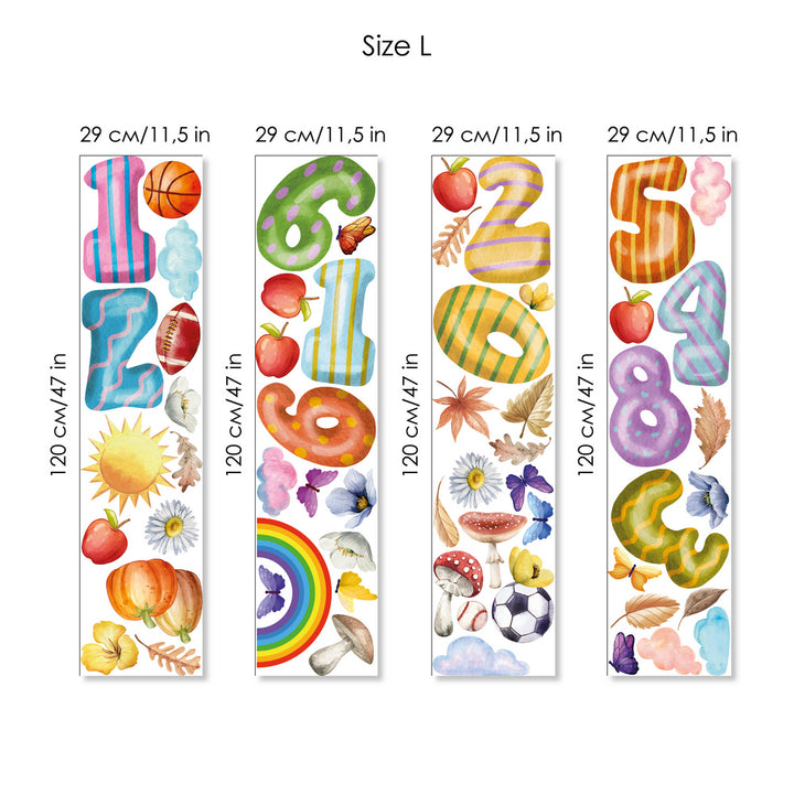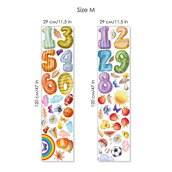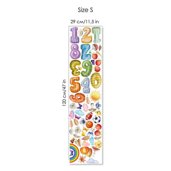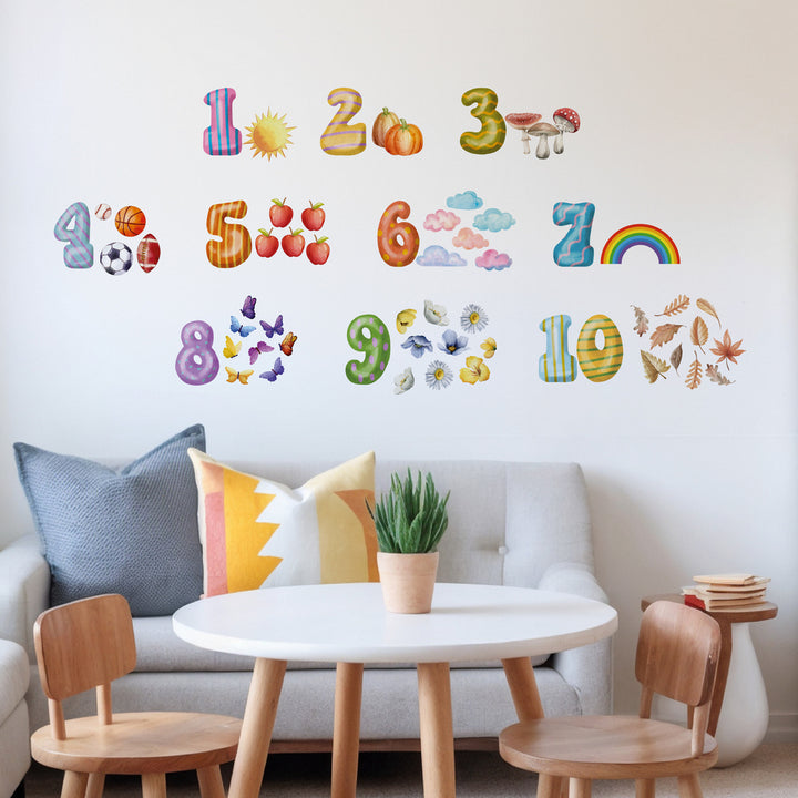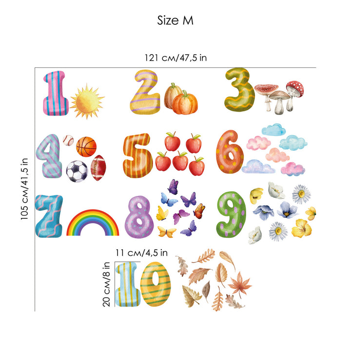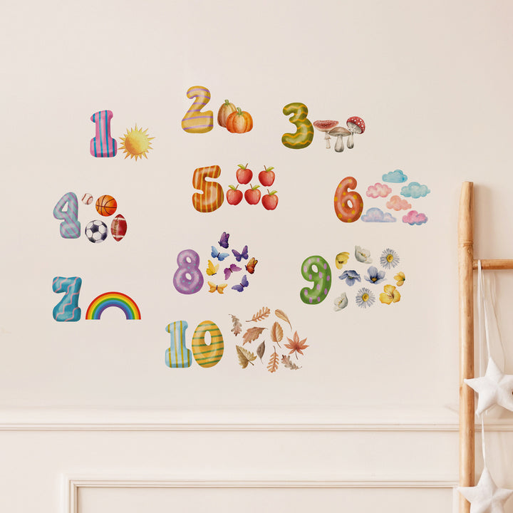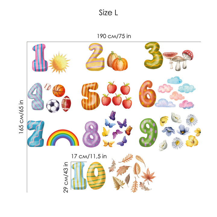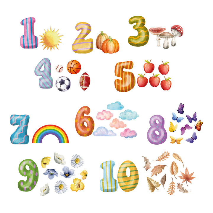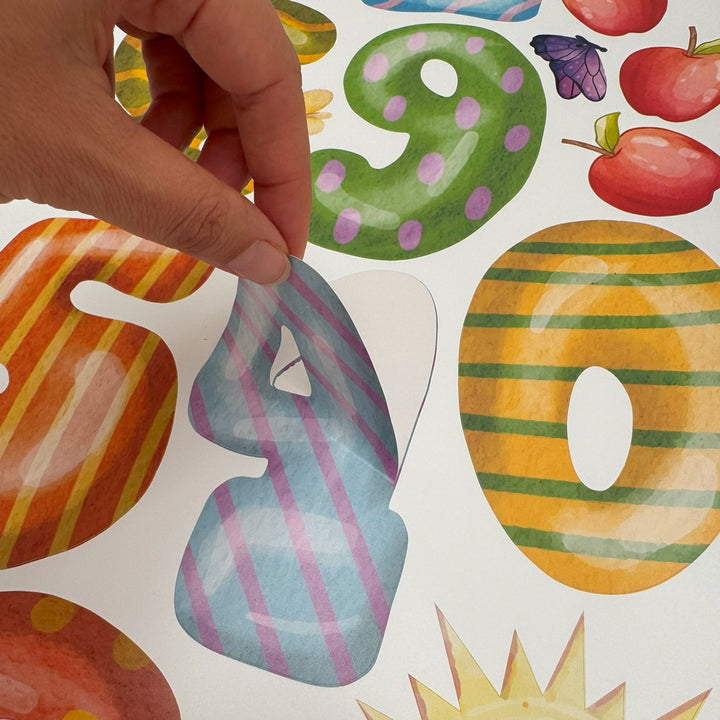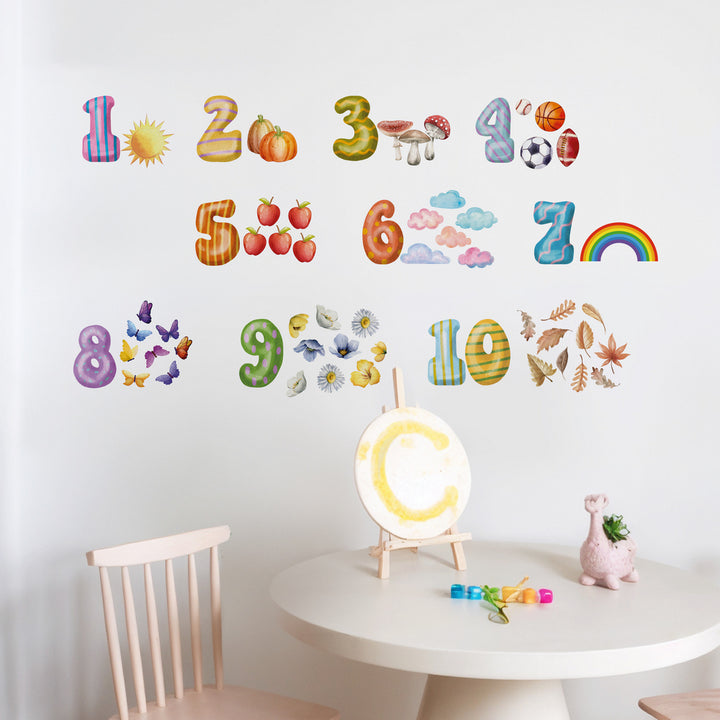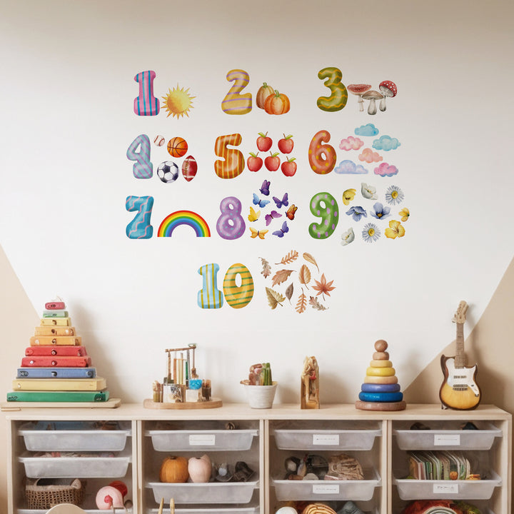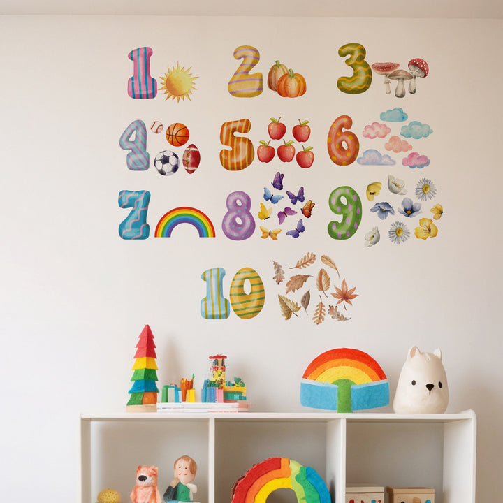 Kolorowe naklejki na ścianę z cyframi 1–10, chmurkami, owocami, motylami i tęczą. Idealne do pokoju dziecka, przedszkola lub szkoły. Ekologiczne, bezpieczne i łatwe w aplikacji. Drukowane w Polsce. Nauka i zabawa...