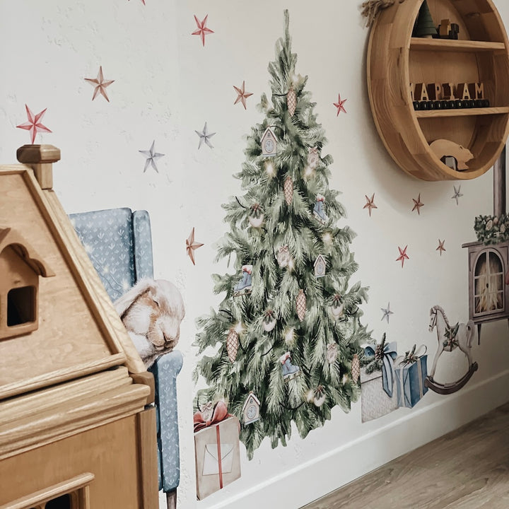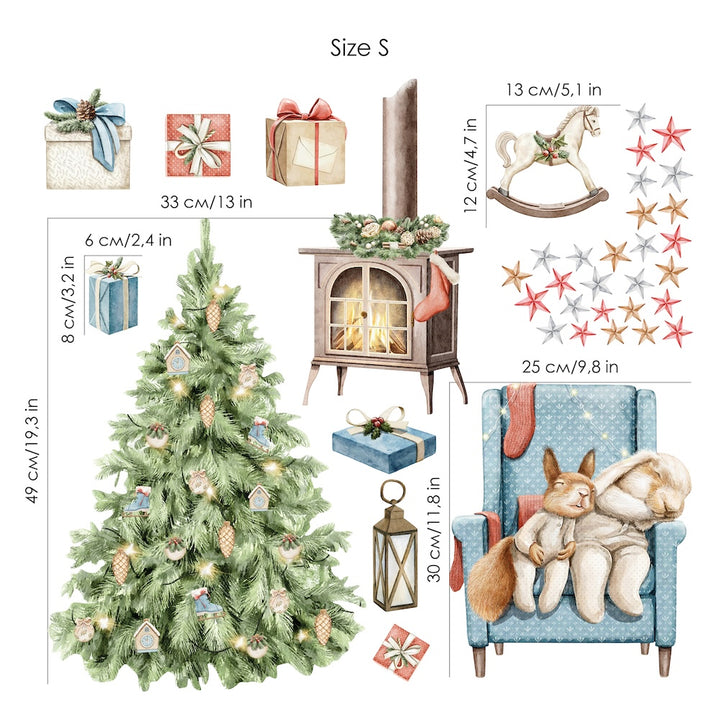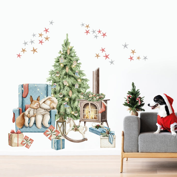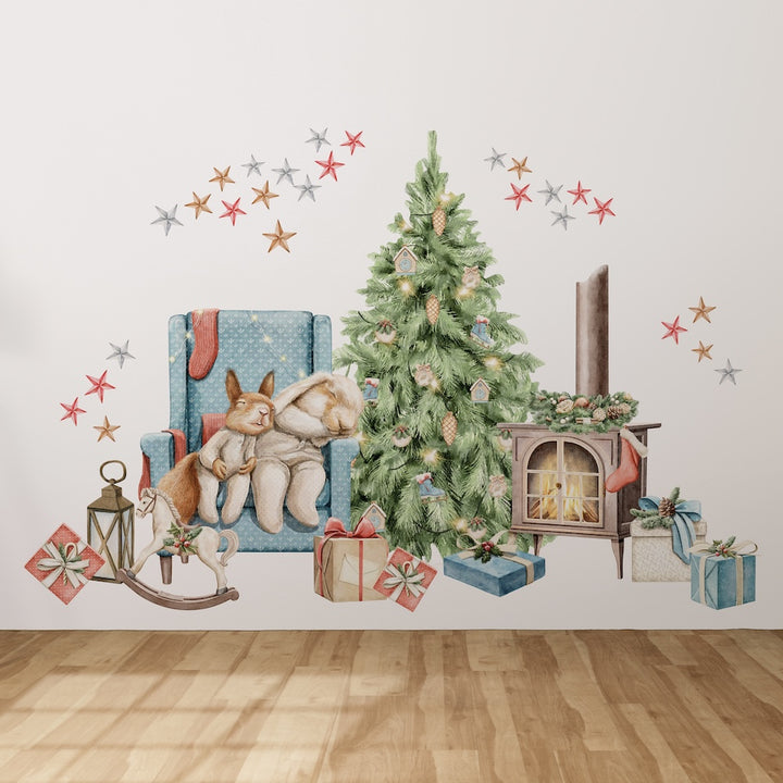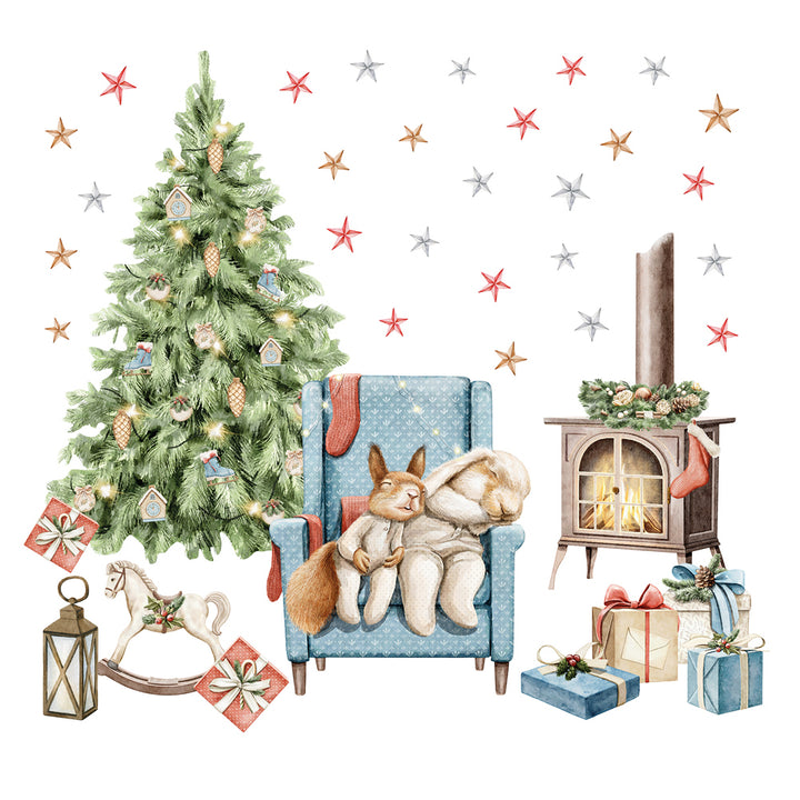 Kominek i Choinka | Świąteczne Naklejki na Ścianę z Prezentami