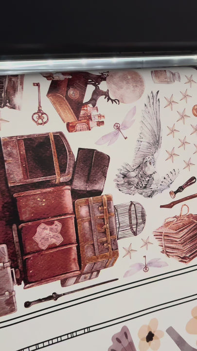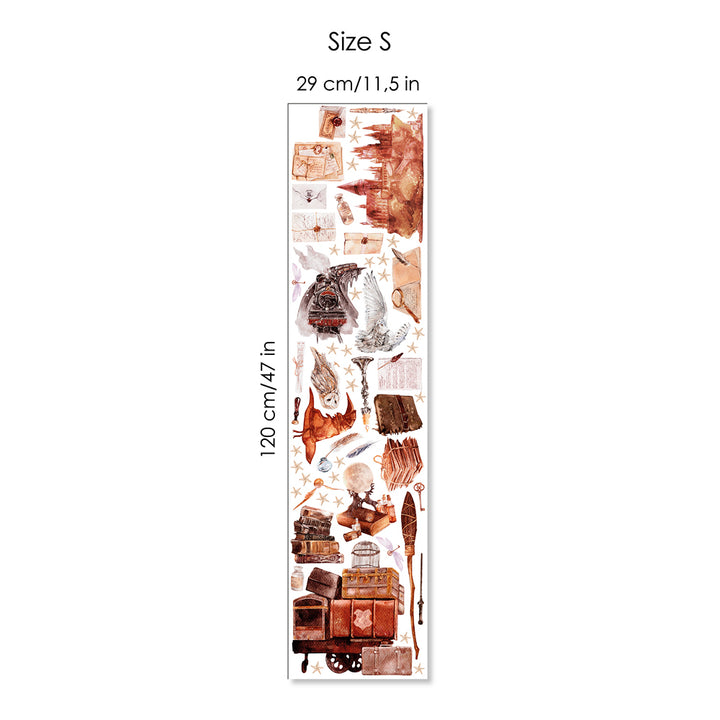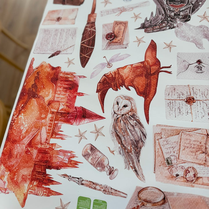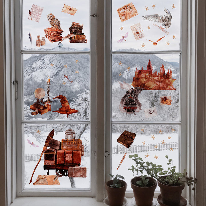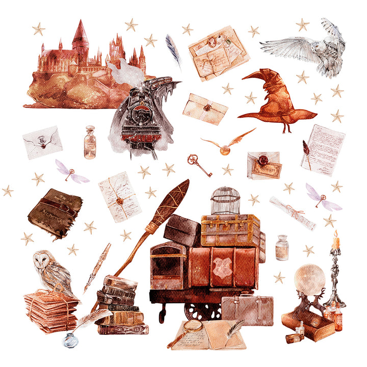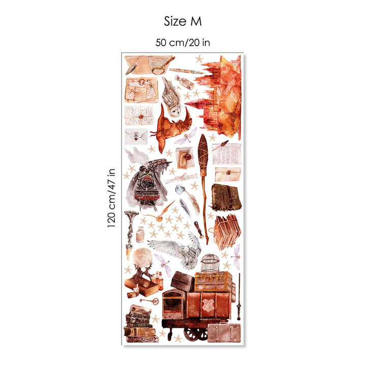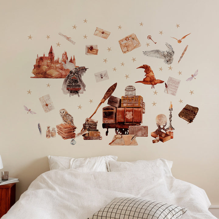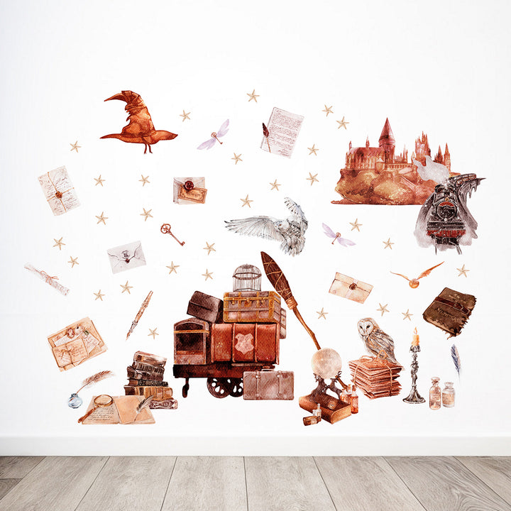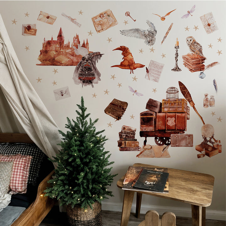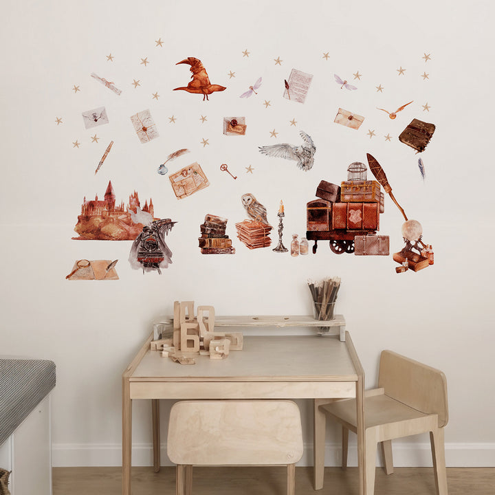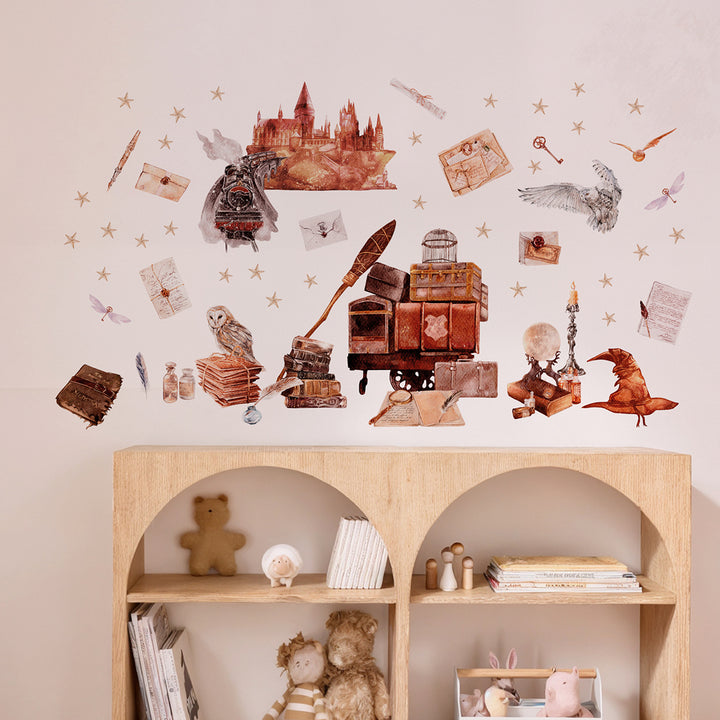 Dodaj magii wnętrzu dzięki naklejkom Czarodzieje. Zamek, sowy, księgi zaklęć, kapelusz i pociąg w stylu fantasy tworzą wyjątkową dekorację pokoju dziecka lub klasy. Łatwe w aplikacji, ekologiczne, drukowane w Polsce przez LipkoDecor.