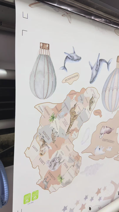 Odkryj świat z naszą edukacyjną naklejką ścienną Mapa Świata! Kolorowa mapa przedstawia kontynenty, oceany oraz charakterystyczne zwierzęta z różnych zakątków globu, dzięki czemu łączy dekorację z nauką przez zabawę. Dostępna w wersji niebieskiej, różowej i beżowej. Napisy w języku angielskim, polskim, niemieckim, francuskim, hiszpańskim, włoskim oraz ukraińskim. Idealna do pokoju dziecka, sali zabaw i przedszkola. Ekologiczny druk w Polsce – LipkoDecor.