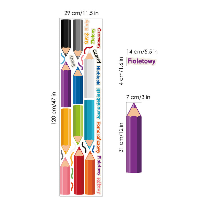 Kolorowe naklejki w kształcie kredek z polskimi nazwami kolorów to świetna pomoc edukacyjna. Ekologiczne, bezpieczne i łatwe w aplikacji. Idealne do pokoju dziecka, szkoły, przedszkola czy sali językowej. Drukowane w Polsce, oryginalne wzory.